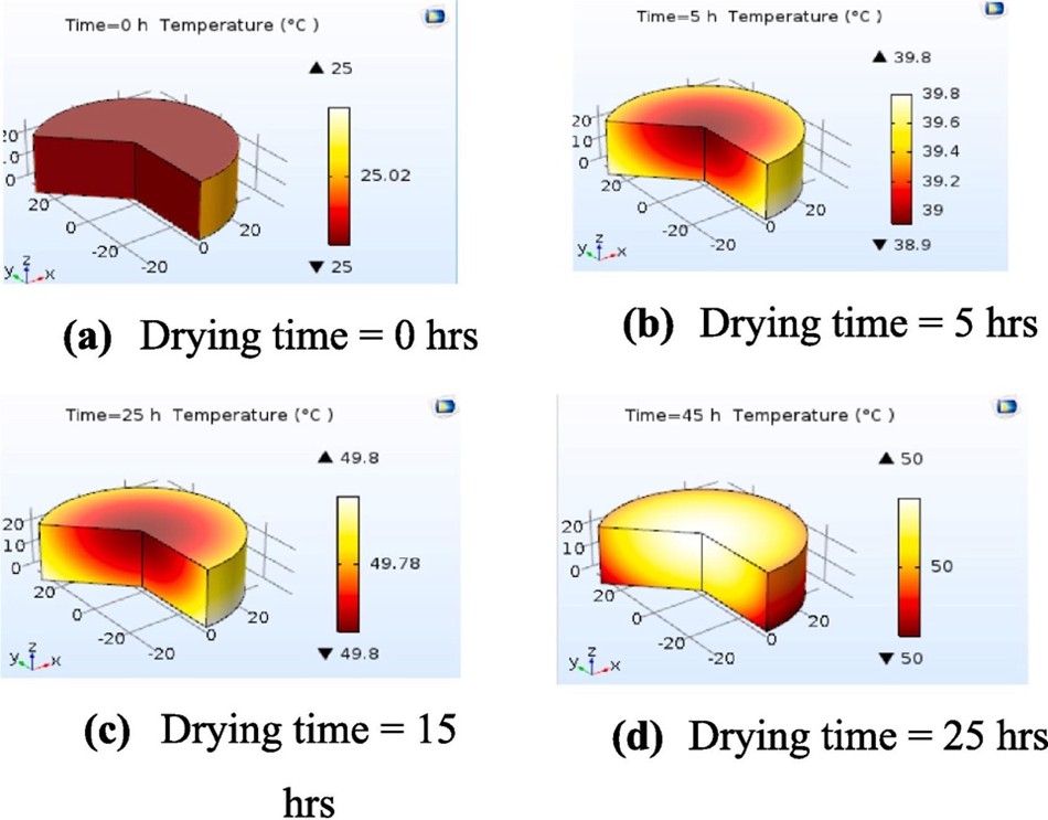 La simulación mostró una alta concordancia con los datos experimentales. De acuerdo con los resultados, a temperaturas de secado superiores a 50 °C la evaporación de agua fue más rápida, evitando contaminación bacteriana. A 60 °C, el tiempo de secado se redujo un 45% en comparación con 40 °C. La Figura 2 y la Figura 3 muestran, respectivamente, el contenido en agua y la temperatura en función del tiempo de secado y la Figura 3 muestra . Los resultados también mostraron que reducir el grosor de las rodajas o aumentar la velocidad del aire permiten reducir el tiempo de secado debido a la menor resistencia al transporte de agua desde el núcleo hasta la superficie. Este estudio destaca el potencial de COMSOL Multiphysics® para modelar y simular procesos de secado de productos agroalimentarios. Su capacidad para predecir la distribución espacial y temporal de temperatura y humedad permite optimizar diseños de secadores y reducir los costos asociados a experimentos físicos. Estos resultados abren la puerta a mejoras en el diseño de secadores solares y sistemas de control automático para procesos industriales.