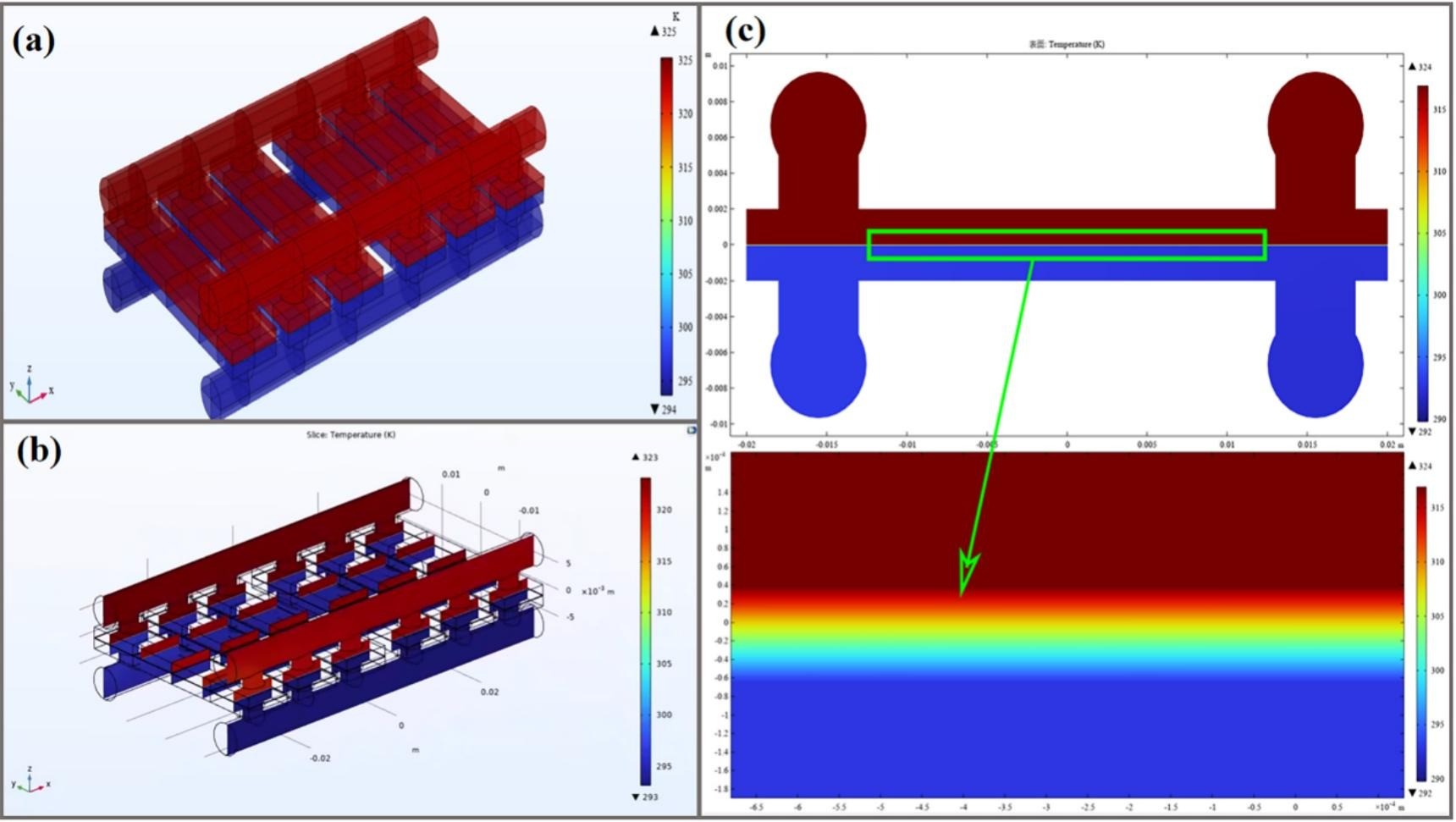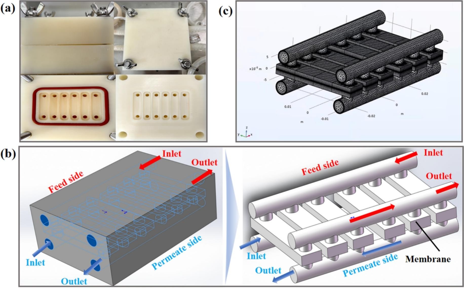 Figura 1. Geometría tridimensional del módulo de membrana DCMD: (a) Estructura del módulo de membrana. (b) Geometría del módulo de membrana. (c) Malla tridimensional para la simulación CFD en COMSOL Multiphysics®.