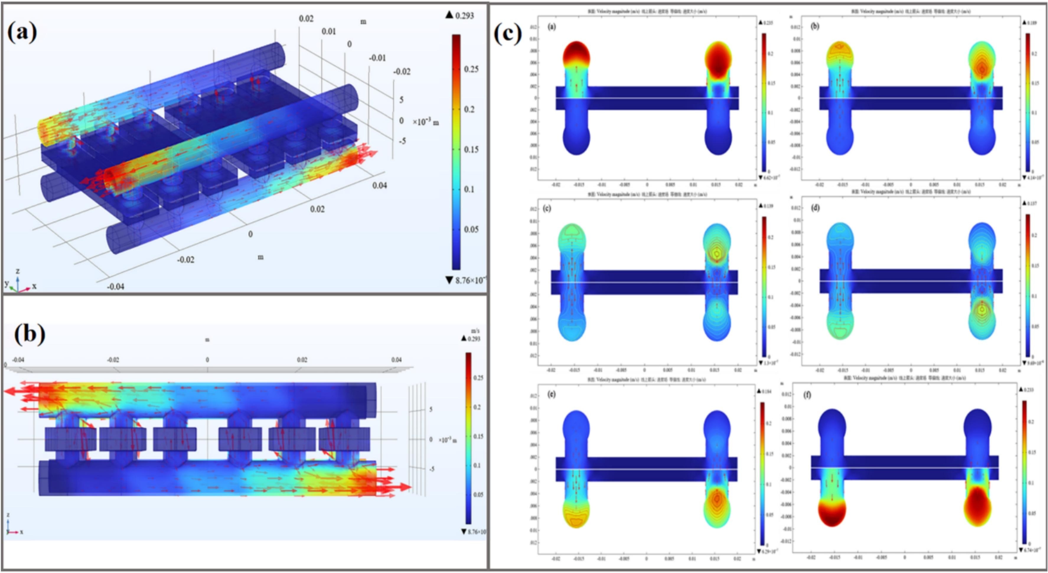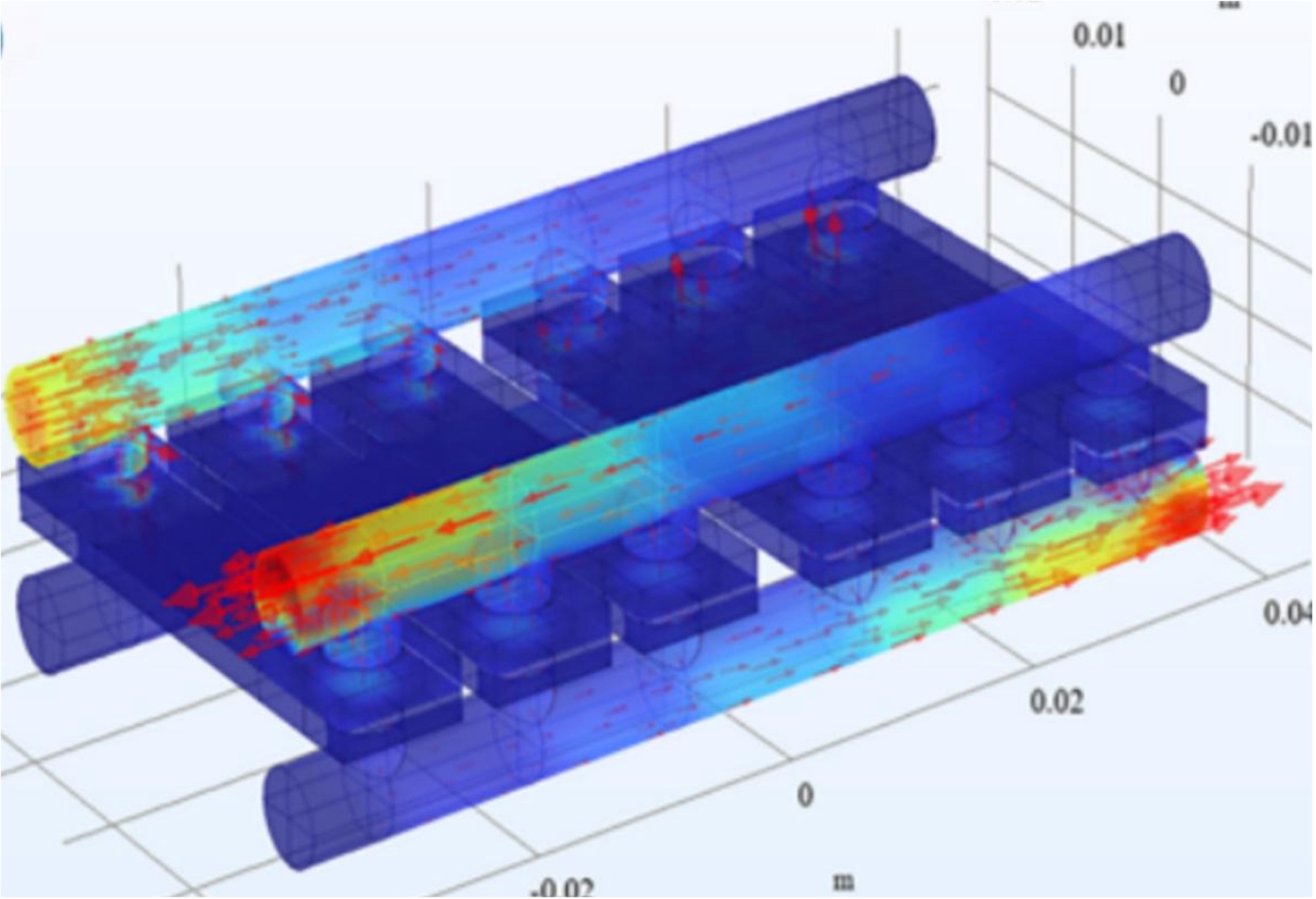 Figura 3. Velocidad calculada para el flujo en los canales del módulo de membrana a partir de las simulaciones en COMSOL Multiphysics®