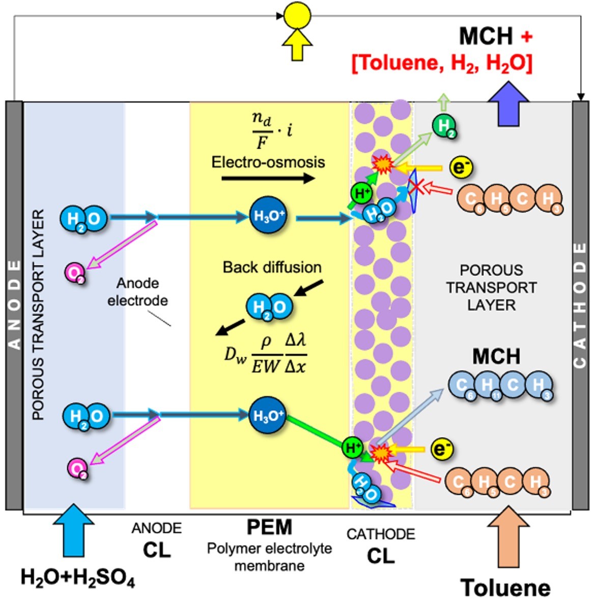 La Figura 1 muestra un diagrama esquemático de dicho electrolizador, que está basado en la tecnología de membrana de intercambio protónico [1]. En comparación con la técnica convencional de hidrogenación de tolueno en dos etapas (es decir, producción de hidrógeno mediante electrólisis y posterior hidrogenación exotérmica del tolueno), este método innovador de una sola etapa ofrece ventajas en términos eficiencia energética [2]. No obstante, en la práctica, el suministro adecuado de tolueno al sitio de reacción del cátodo (es decir, la capa catalítica) es crucial para alcanzar una buena proporción de hidrogenación.
