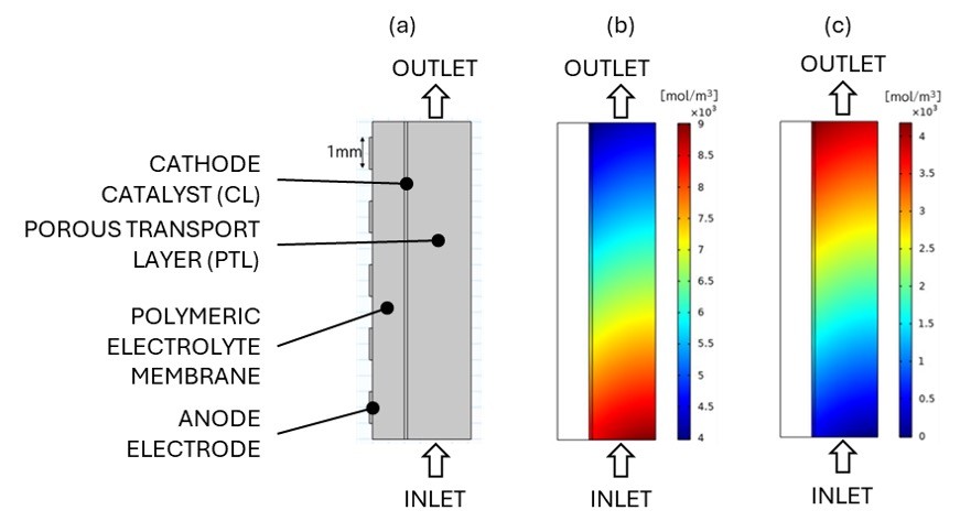 El modelo que desarrollan en COMSOL Multiphysics® acopla los distintos mecanismos y ecuaciones que describen el comportamiento del sistema: ecuaciones de continuidad para las fases acuosa y oleosa, la ecuación de convección-difusión para determinar la concentración de tolueno y MCH en el lado del cátodo (tanto en la capa del electrocatalizador como en el electrodo poroso), el transporte de agua a través de la membrana polimérica electrolítica, y las ecuaciones de conservación de la corriente eléctrica. Los resultados de la simulación numérica permiten estimar la concentración de especies en el lado del cátodo (es decir, acumulación de fase oleosa y agua líquida), la absorción de agua en la membrana y la distribución de la densidad de corriente en el electrodo del cátodo.