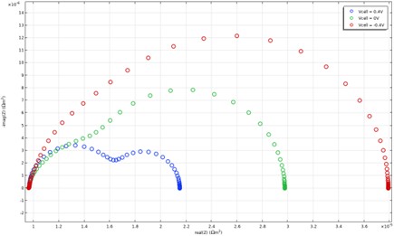 - Impacto de la transferencia de masa. La Figura 2 muestra los resultados de una simulación de EIS en COMSOL Multiphysics® para estudiar contribuciones de la cinética de la reacción y el transporte de masa a voltajes de operación de 0,4 V, 0 V y -0,4 V.