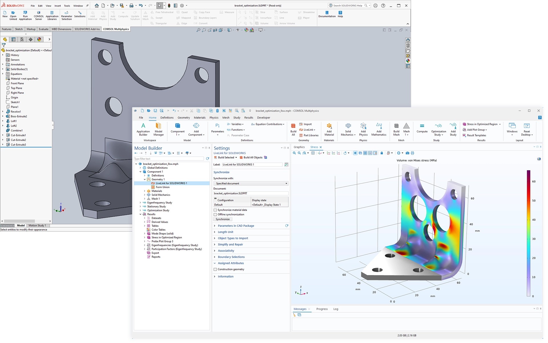 Figura 2. La interfaz de usuario de SOLIDWORKS® muestra la geometría original, mientras que la interfaz de usuario de COMSOL Multiphysics® muestra el soporte optimizado.