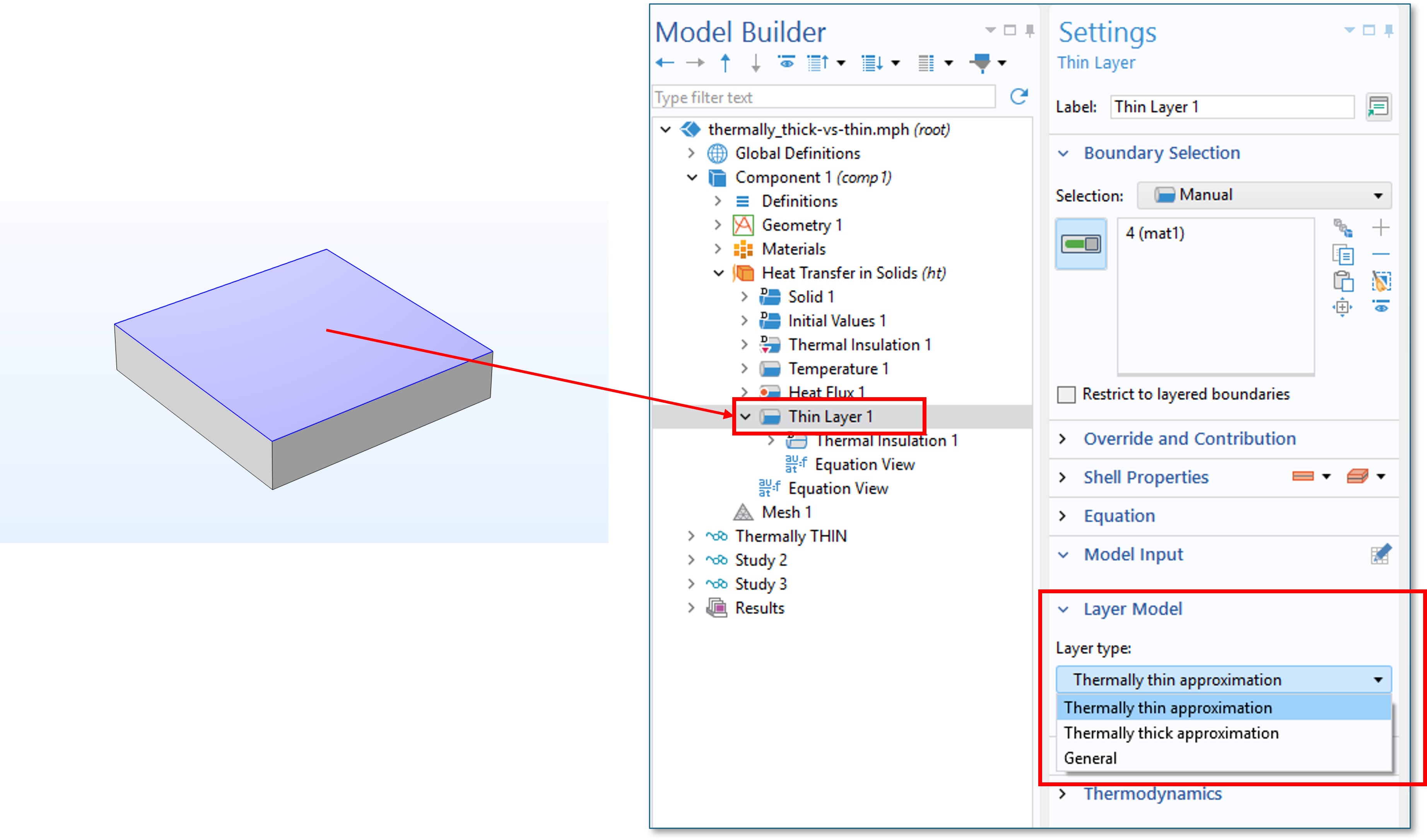 - General Model: Esta opción te deja toda la libertad. No se asumen simplificaciones y el modelo se construye con las ecuaciones completas a través del espesor. Es la opción adecuada cuando la capa delgada deja de ser “tan delgada” en términos térmicos, o si necesitas capturar fenómenos más complejos.