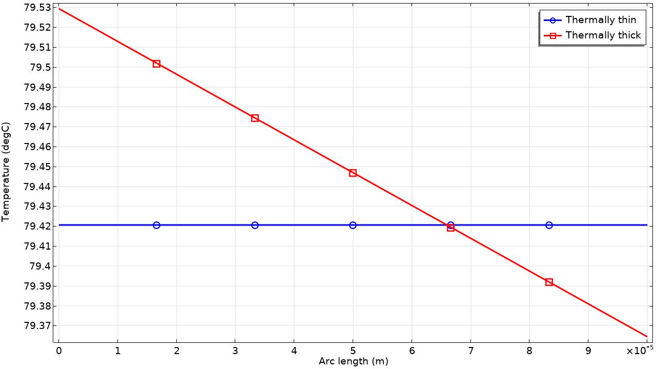 Figura 2. Evolución de la temperatura a lo largo del espesor de una superficie delgada, considerando las aproximaciones de Thermally Thin y Thermally Thick como modelo de capa en COMSOL Multiphysics®.