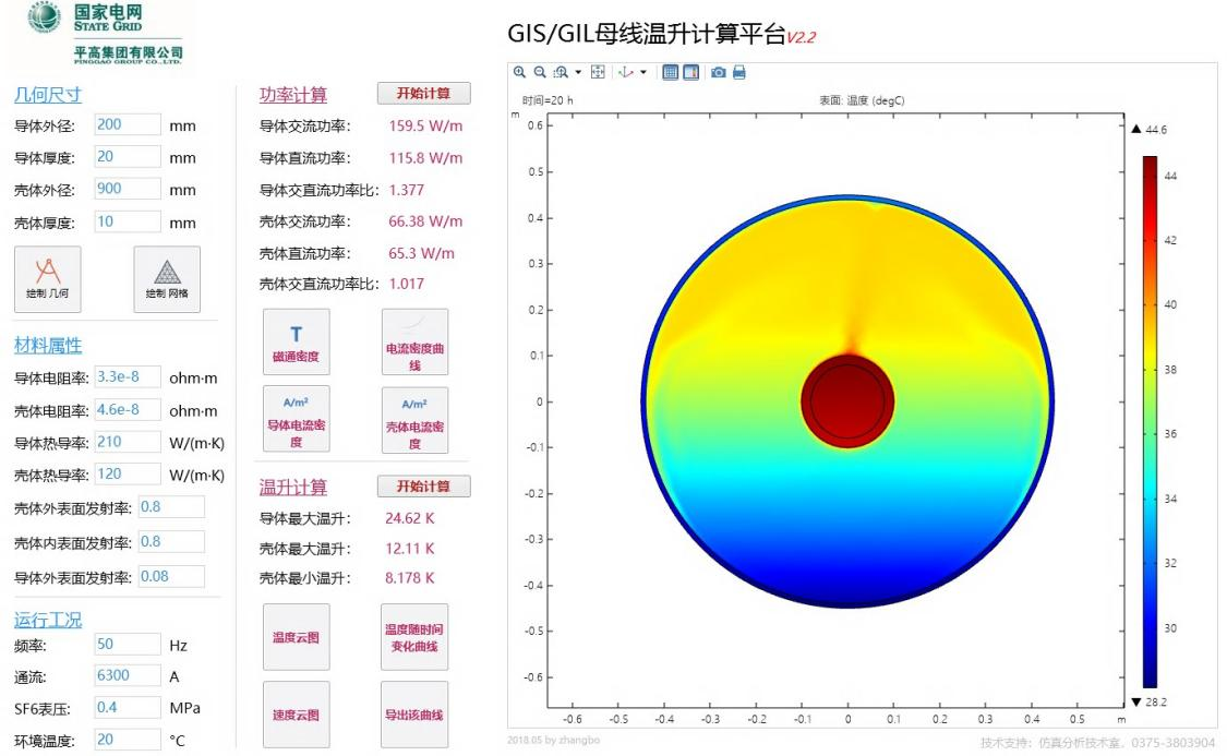 Una de las aplicaciones destacadas que han sido creadas por el Grupo Pinggao se utiliza para calcular el cambio de temperatura que ocurre en el conductor colector (busbar) de un interruptor de alta tensión debido al calentamiento electromagnético. La Figura 3 muestra una captura de pantalla de una de las aplicaciones desarrolladas y que tiene las siguientes entradas y salidas: