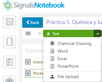 Dentro de la carpeta inteligente “experimento” se podrá adjuntar múltiples tipos de archivos, entre los que cabe destacar la importación de archivos word, excel y power point, posible gracias a la integración con MS Office y MS Office Online y estructuras o compuestos creados a partir de ChemDraw.