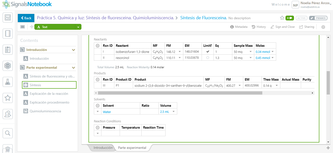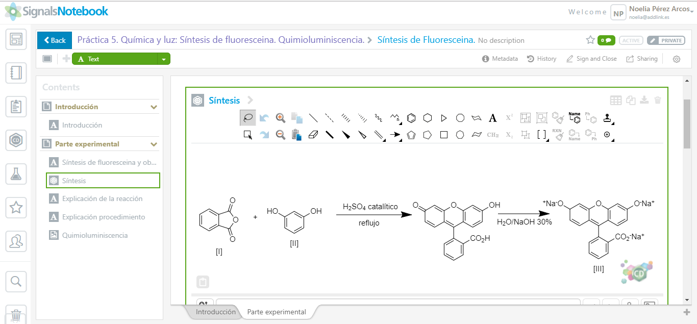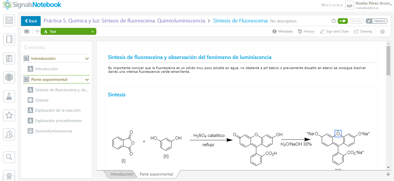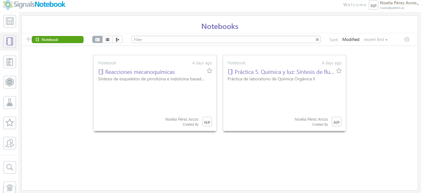 Crea, almacena, organiza y comparte tu trabajo de laboratorio con otros usuarios de Signals Notebook. En esta noticia vamos a simular los pasos que debe seguir cualquier investigador para crear un cuaderno de laboratorio que posteriormente podrán revisar o, incluso, compartir con jefes de sección o demás compañeros de laboratorio. ¿Introducción, parte experimental, cálculos y conclusión junto dentro de una misma plataforma? Es posible. ¿Modificar información sin necesidad de transportar físicamente el cuaderno allá donde vayas? También lo es.