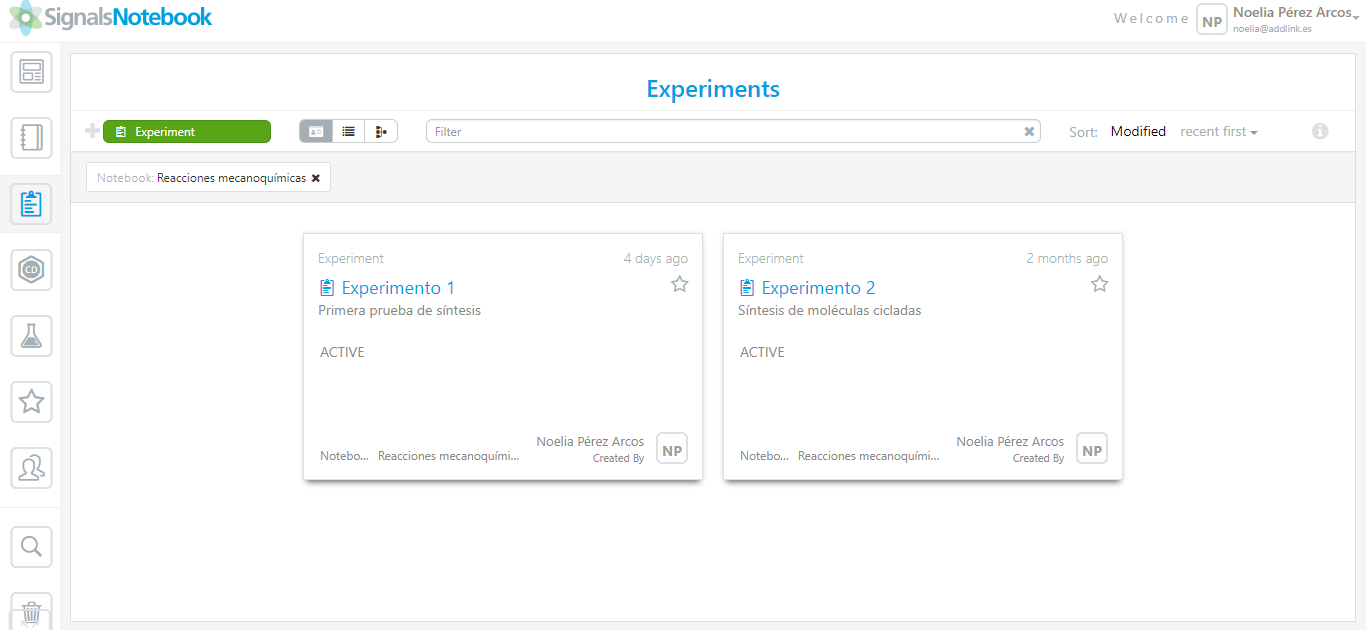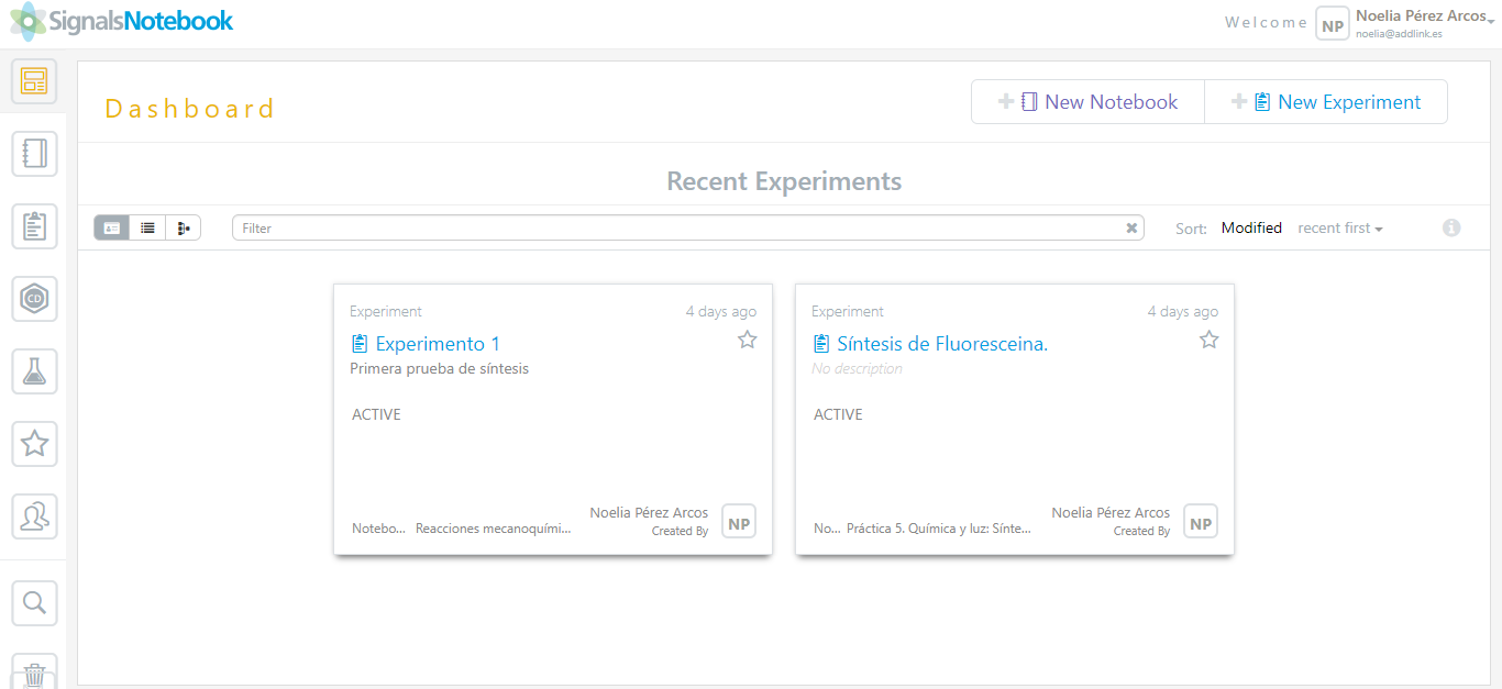 - Tablero: Permite al usuario acceder a experimentos recientes, así como la posibilidad de crear nuevos cuadernos y experimentos.
