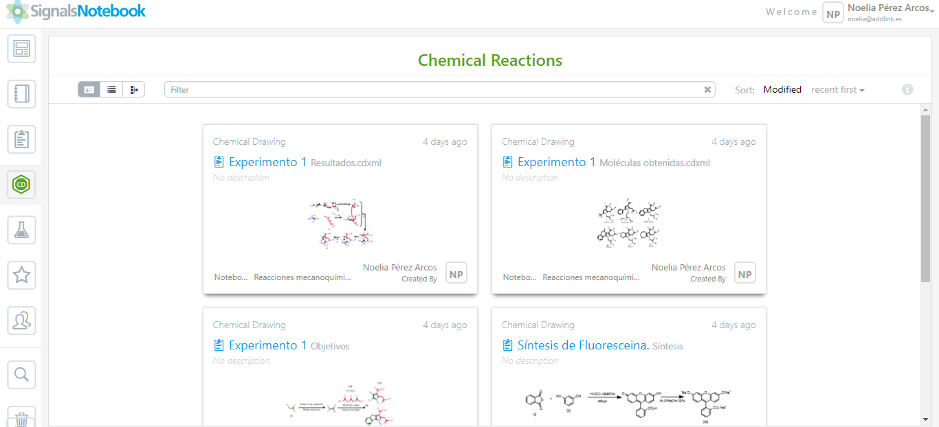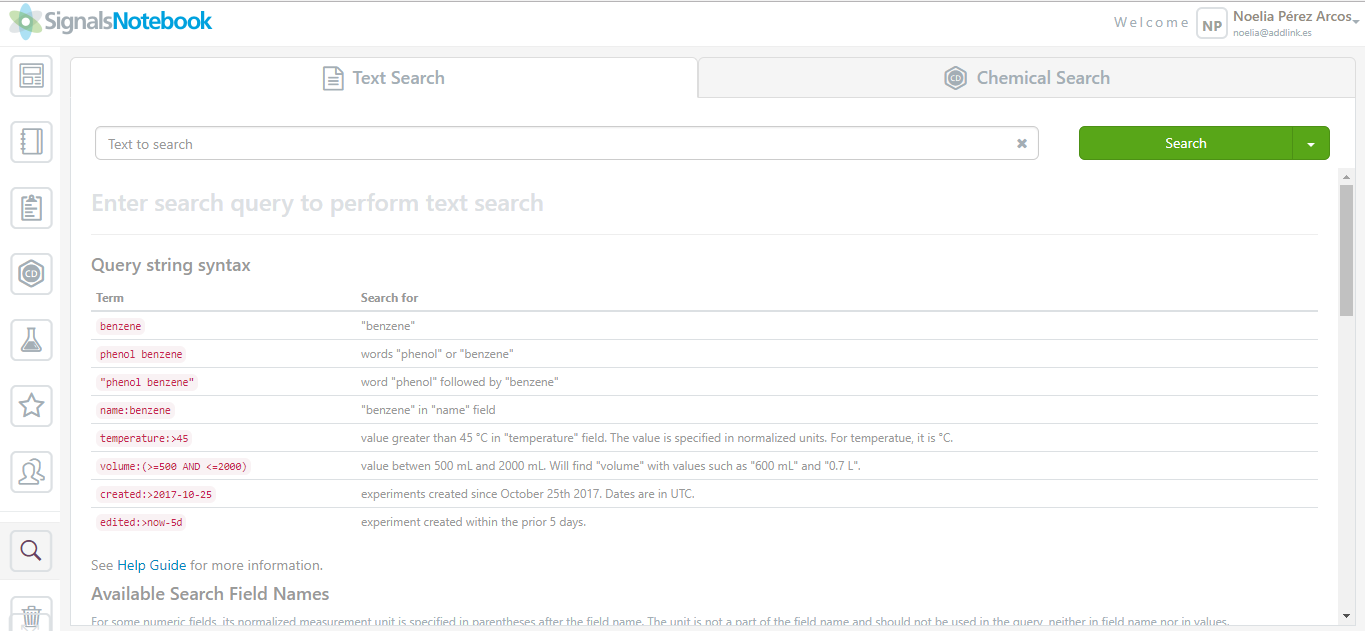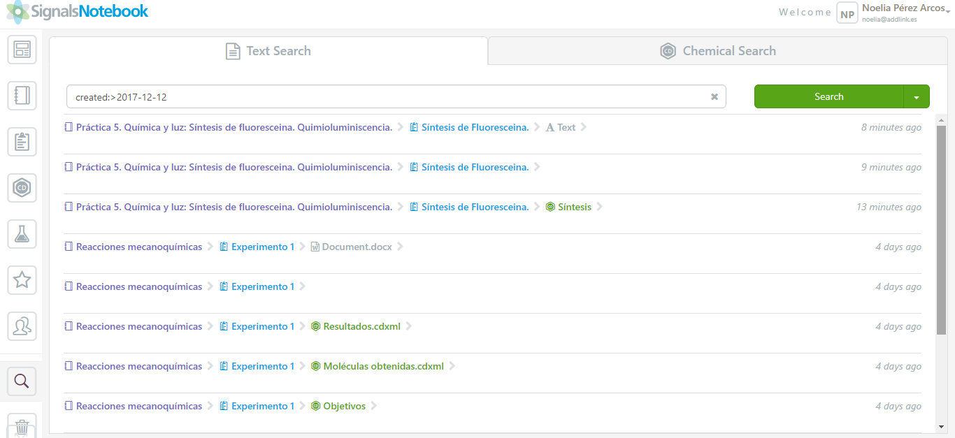 - Modo búsqueda: Dentro de este apartado el usuario puede buscar información almacenada en cualquier tipo de carpeta (desde cuadernos hasta experimentos, o incluso reacciones químicas) pero no información que haya sido eliminada. La búsqueda puede realizarse por nombre, descripción, etiqueta o incluso estructura química.
