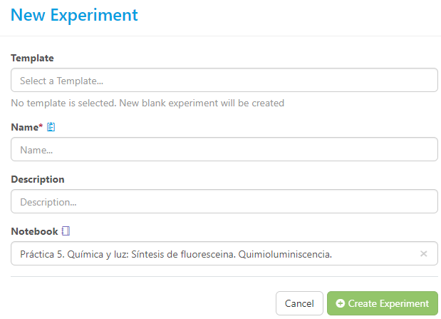 Una vez creado el cuaderno se podrá almacenar información en forma de experimentos, que crearemos en un paso posterior a partir de la ventana que se muestra a continuación.