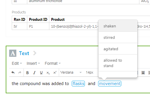 Los fragmentos de texto o listas se seleccionarán a través de la barra de herramientas del elemento “texto”. Alternativamente, los accesos directos existentes se han extendido. Además de escribir “#” para acceder a los reactivos, productos, disolventes y condiciones de reacción, se podrá acceder a los fragmentos de texto y cualquier plantilla escribiendo “$” y listas escribiendo “!”. Al presionar Esc se insertan estos caracteres como texto libre.