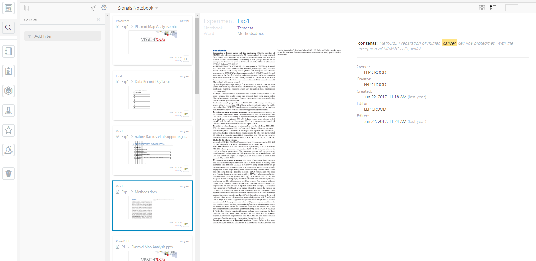 Las últimas novedades de Signals Notebook se centran, sobre todo, en mejoras en la búsqueda de información dentro del cuaderno de laboratorio electrónico.