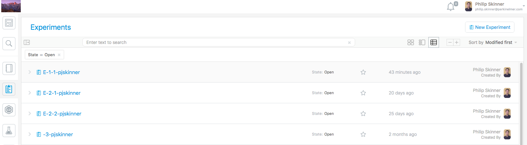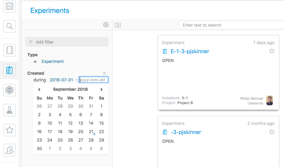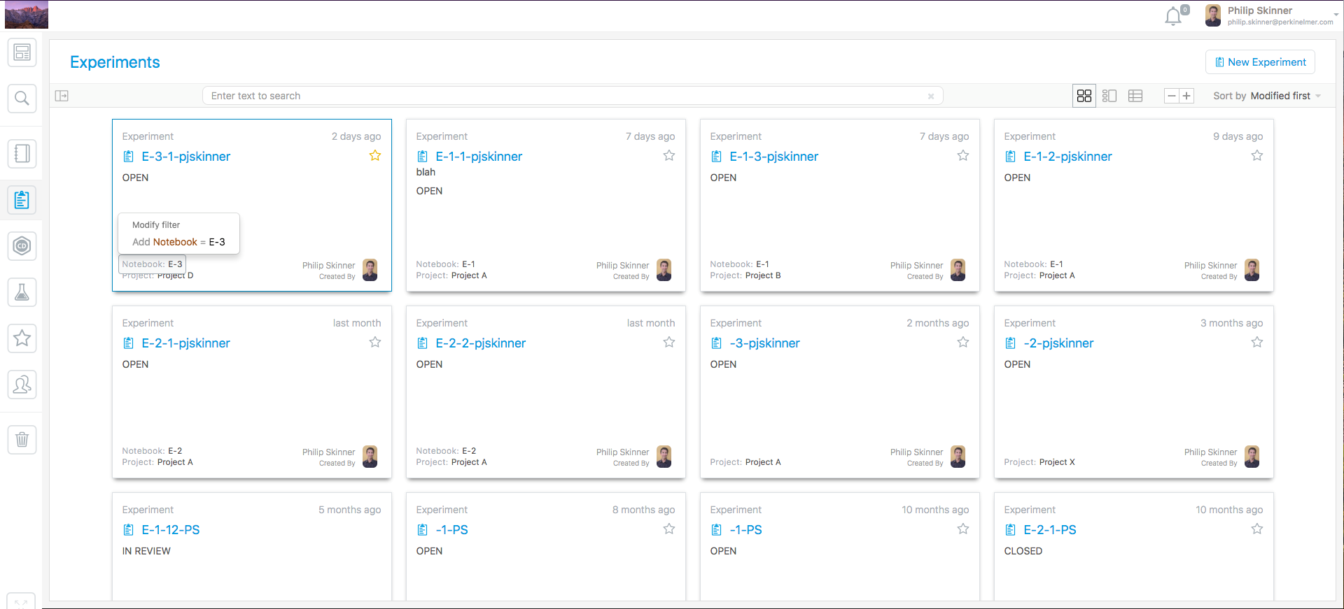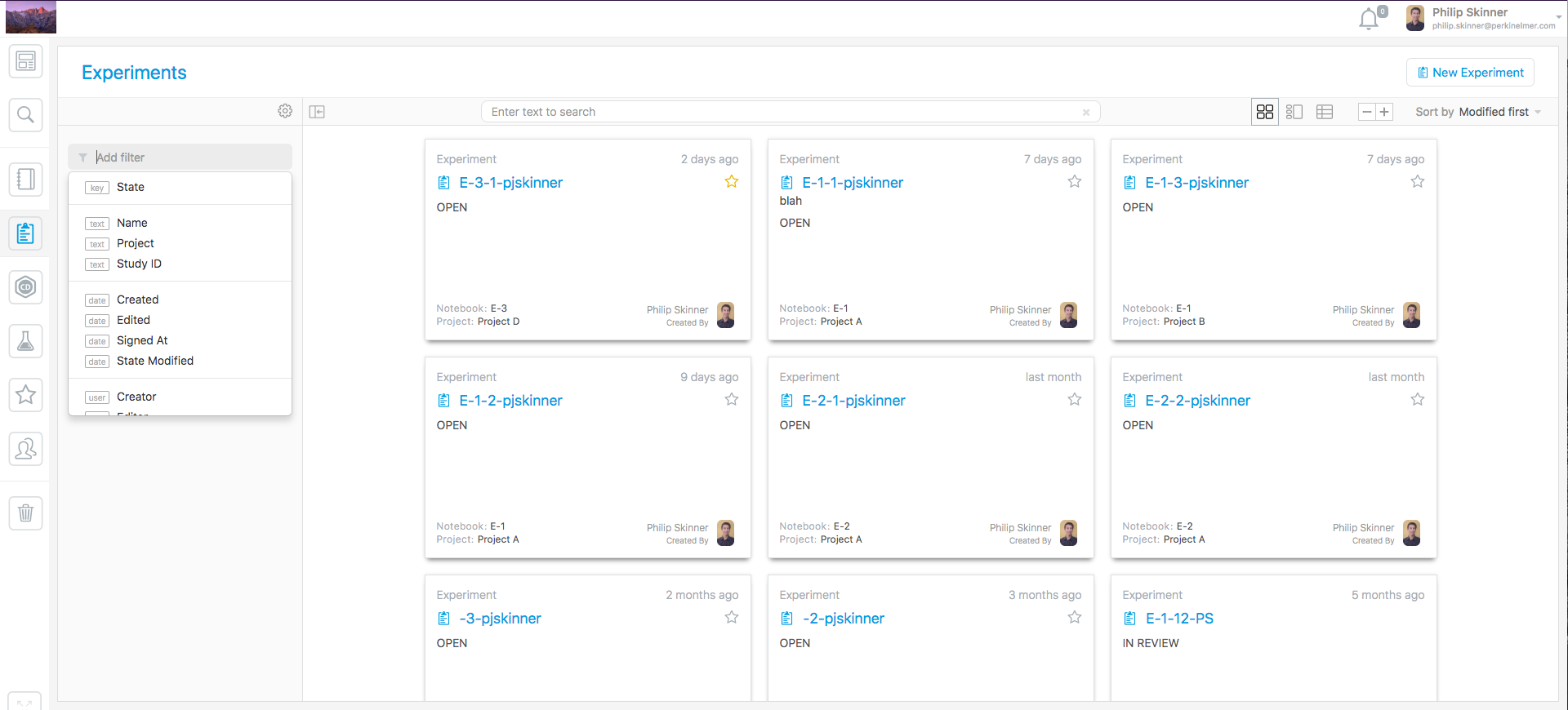 Los cuadernos, experimentos, reacciones y compuestos químicos se han actualizado para ser coherentes con los cambios recientes en la interfaz de búsqueda. Cualquier filtro que aparezca en las carpetas puede ser clicado para ampliar la información.