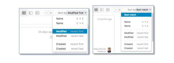 Se han incluido clasificaciones adicionales, filtros y opciones de visualización para facilitar y potenciar la herramienta de búsqueda. Las clasificaciones pueden ordenarse por nombre, creación o fecha de modificación, en orden creciente o decreciente.