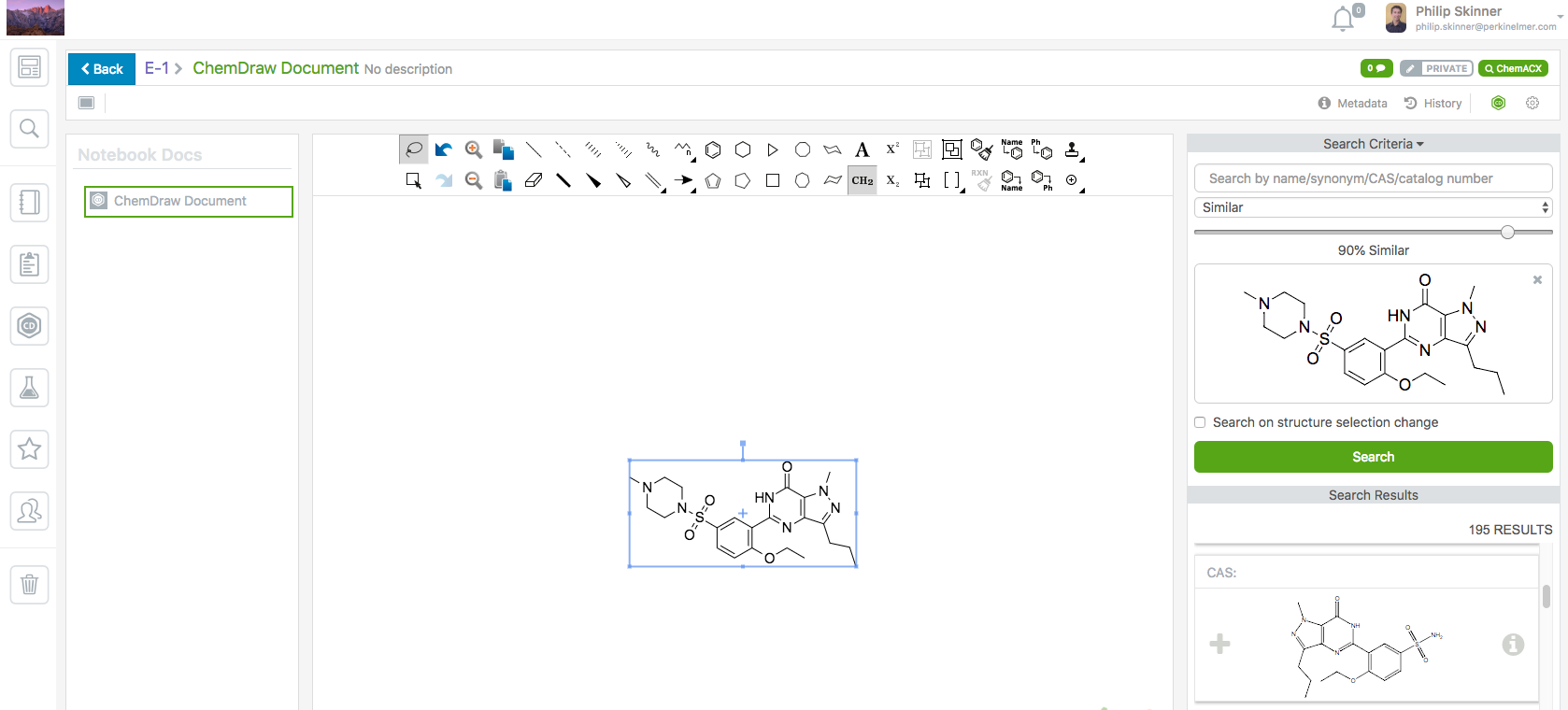 ChemACX ahora está disponible en los documentos de dibujo químico para documentos agregados desde ChemDraw y para aquellas estructuras que se dibujan directamente en el cuaderno.