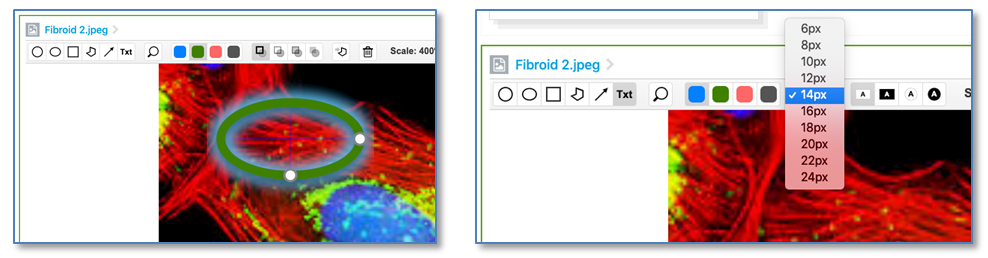 Se han agregado a Signals Notebook algunas mejoras a las capacidades de anotación de imágenes. Se ha agregado la forma elipse para indicar áreas de interés y se han ampliado los tamaños de fuente para el texto de anotación.
