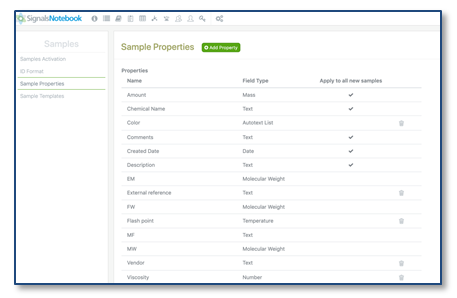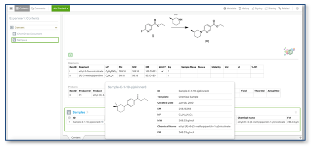 Una vez que el administrador ha activado la capacidad, ahora pueden agregar muestras a sus experimentos. Las muestras químicas se pueden crear a partir de reactivos o productos dentro de un experimento. También se pueden crear otros tipos de muestras con propiedades definidas por el administrador. Las muestras se almacenan en una tabla de muestras dentro de un experimento.
