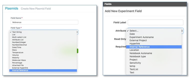 El tipo de propiedad de referencia interna se ha ampliado para incluir ahora Propiedades (Experimento y Cuaderno) y Materiales.