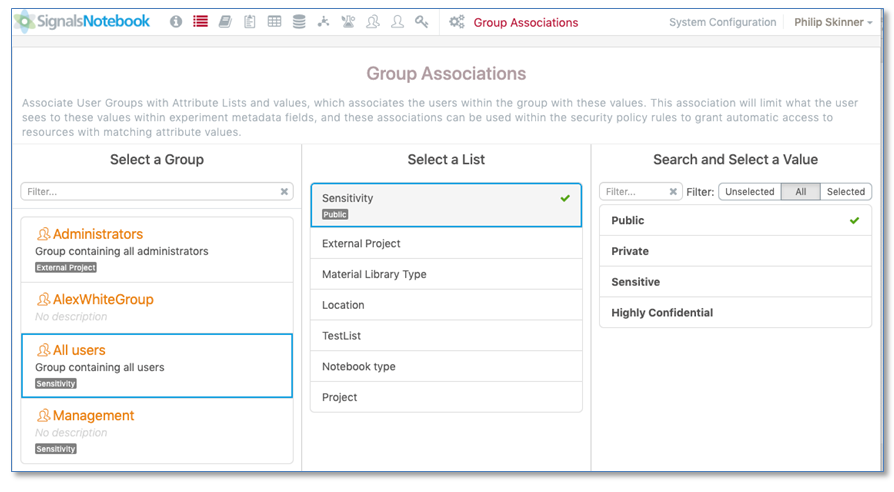 La página de Asociaciones de grupos también se ha mejorado. Los tipos de listas asociadas con Grupos ahora se muestran en los Grupos relevantes. Los valores de las listas ahora también se pueden filtrar, ya sea mediante un filtro de escritura anticipada o mediante el filtrado solo a los valores seleccionados o los valores no seleccionados.