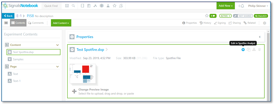 Si el usuario guarda un archivo de Tibco Spotfire (.dxp) en Signals Notebook, el archivo de Spotfire se puede iniciar en el cliente de Spotfire Analyst para su posterior edición.