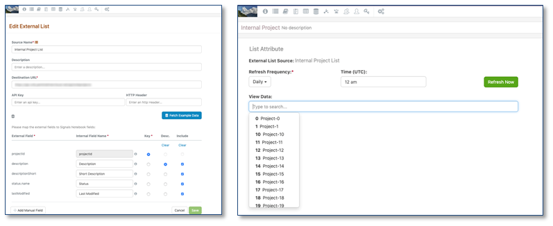 El administrador ahora puede definir las fuentes externas que se utilizarán para los atributos del experimento. Las listas externas se configuran conectándose a una API externa. Se puede identificar el campo clave, un campo adicional que se puede usar como descripción y los campos adicionales que se muestran en Propiedades. Una vez que se configura la fuente, la lista se puede usar como un Atributo e incluirse en las Plantillas del sistema.