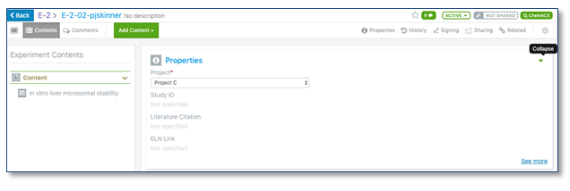 Las propiedades de experimento y plantilla (metadatos) ahora se muestran en línea además de desde la vista de propiedades. Esta nueva vista se puede expandir o contraer como se desee.