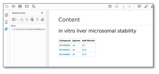 Cuando el experimento que contiene una tabla se imprime en PDF y los documentos se incrustan como archivos adjuntos, también se incluye un archivo .csv de la tabla en el PDF.