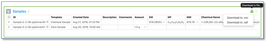 Las muestras ahora admiten la descarga de datos en un archivo .sdf o .csv. Las propiedades mostradas se incluyen en el archivo de descarga.