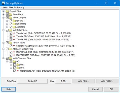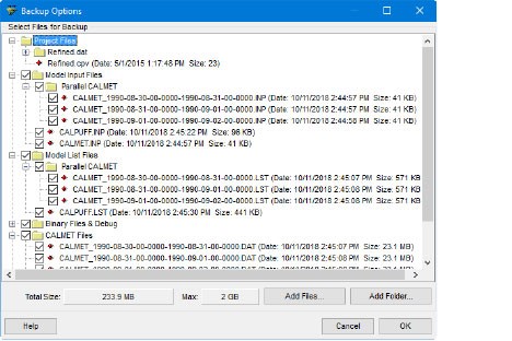 La utilidad Backup puede incluir la mayoría de los archivos del proyecto incluyendo los archivos Multi-Chemical Files de AERMOD View, los archivos Parallel CALMET de CALPUFF View, y muchos más.
