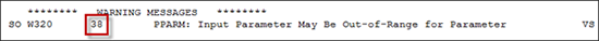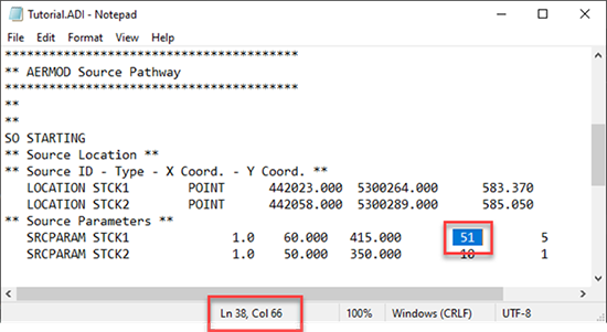 Esto es útil para identificar la ubicación de errores dentro de los archivos del modelo. Por ejemplo, AERMOD siempre imprime un número de línea en los mensajes de advertencia y error. El siguiente mensaje de advertencia hace referencia a la línea 38 como la ubicación de un posible parámetro de fuente fuera de rango (VS para velocidad de salida).