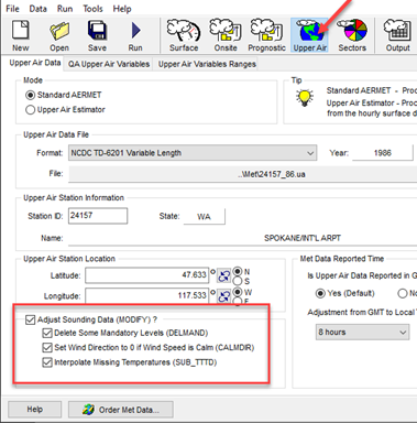 En AERMET View versión 11, las opciones MODIFY se encuentran en Upper Air Pathway. Seleccione el botón Upper Air y marque la casilla de verificación Adjust Sounding Data (MODIFY) para utilizar la palabra clave. Cuando el ejecutable de AERMET seleccionado es la versión 22112, los usuarios pueden habilitar (marcar) o deshabilitar (desmarcar) cada acción individualmente.