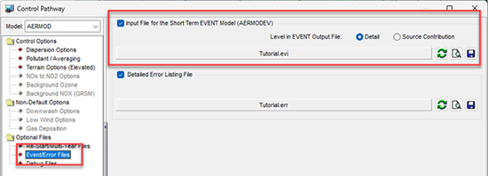 Para iniciar el procesado de EVENTOS (EVENT), primero debe configurarse AERMOD para que genere un archivo de entrada de procesado de EVENTOS. Esto se realiza mediante la ruta de control Control Pathway. En AERMOD View encontrará esta opción en la sección Event/Error Files.