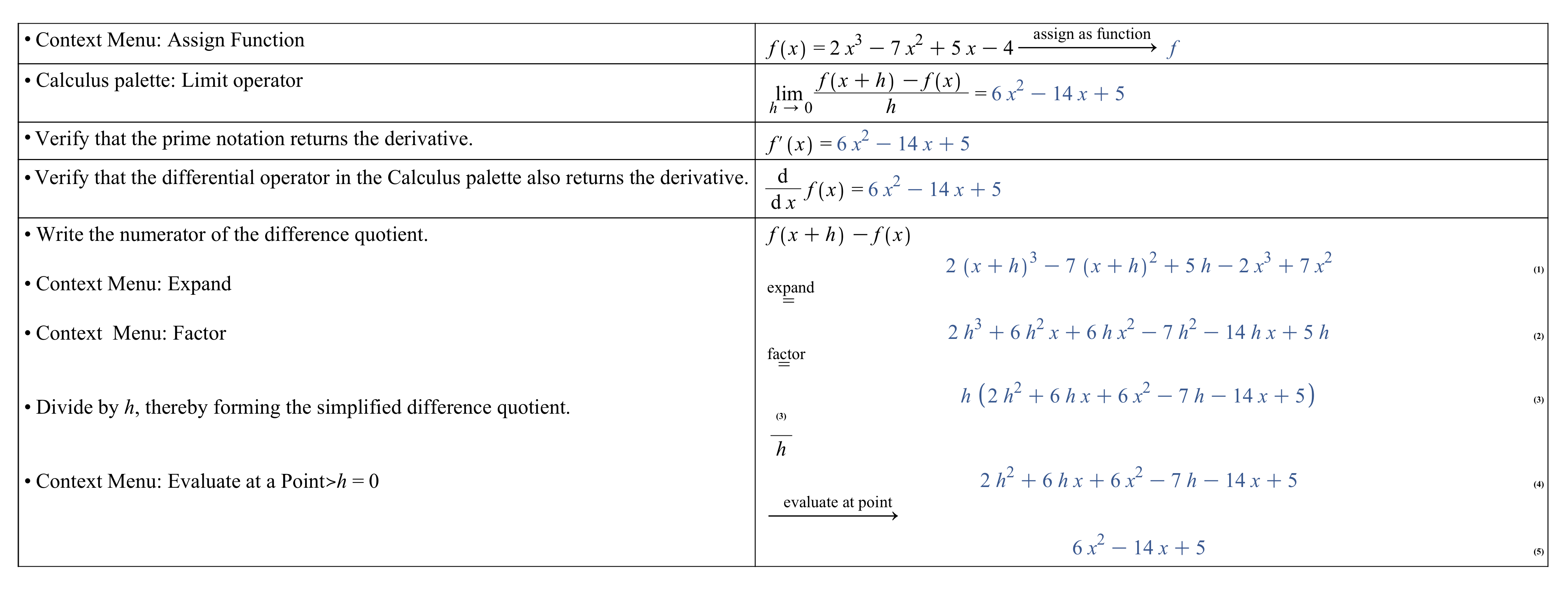 En la Figura 1, la definición de la derivada como el valor límite del cociente de la diferencia se aplica a un polinomio. Observese la pedagógica "resecuenciación" mediante la cual Maple primero proporciona el resultado final, y entonces se utiliza para implementar los pasos algebraicos de la derivación. Según la Figura 1, el polinomio se ingresa como la función y la definición de la derivada, es decir, el límite del cociente de la diferencia, se implementa a través de la notación matemática natural de Maple, tal como aparecería en un libro de texto. La evaluación es inmediata a través del menú contextual (un menú emergente desde el que se pueden seleccionar opciones), o de manera equivalente, a través del teclado. La derivada también se obtiene utilizando las notaciones de Newton y Leibniz, solo para verificar que estas notaciones significan exactamente lo que la definición afirma. Finalmente, los pasos algebraicos del cálculo se implementan en Maple, principalmente a través del sistema del menú contextual.