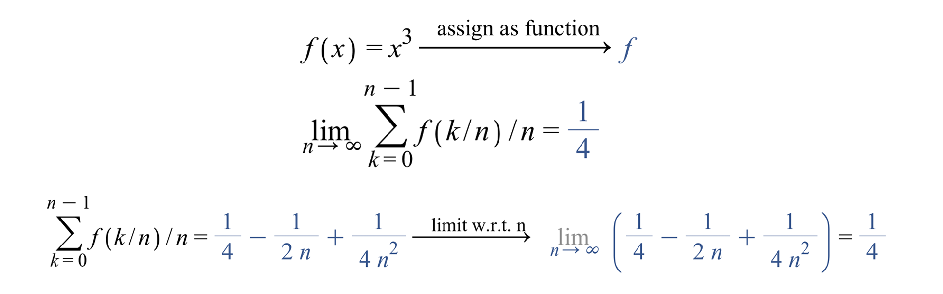 La Figura 4 de nuevo ilustra la definición de la integral definida, esta vez implementada con la tecnología libre de sintaxis "apuntar y clicar" de Maple. El integrando se define como una función a través del Menú Contextual emergente. Los operadores de límite y suma están implementados como plantillas de paleta. La evaluación del límite a la izquierda del sumatorio de riemann se realiza por el Menú Contextual. La matemática de la Figura 3 es exáctamente la matemática que un libro de texto utilizaría para expresar el mismo concepto. La observación más significativa es que Maple puede utilizar la misma notación, y que esta notación está conectada con el motor de cálculo subyacente.