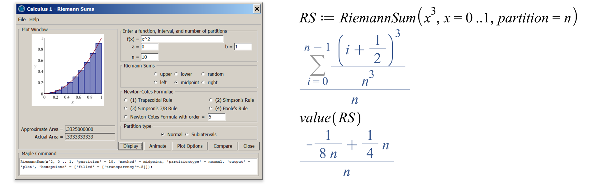 La suma de Riemann de la Figura 5 se construye a partir de una plantilla de paleta, y se evalúa con una expresión de forma cerrada invocando el Menú Contextual o su tecla equivalente. Esta transición requiere algunas habilidades algebraicas. En una clase tradicional, se debería de emplear un considerable tiempo y energía para este paso. Para cuando los estudiantes llegan a tener la suficiente capacidad para evaluar la suma de Riemann a mano, la conexión del proceso con la definición de la integral definida ya se ha evaporado. La adquisición de habilidades de manipulación manual interfiere con la absorción de los conceptos de alto nivel para los que la manipulación se supone que sirven. Si la herramienta con la que estas hacer estas manipulaciones fuera ella misma igual de difícil de dominar, sería un lavado - un proceso complicado reemplazado por otro. Que una herramienta como Maple pueda reemplazar fácil y naturalmente una manipulación tediosa es importante para la continuidad en la exposición de un concepto.