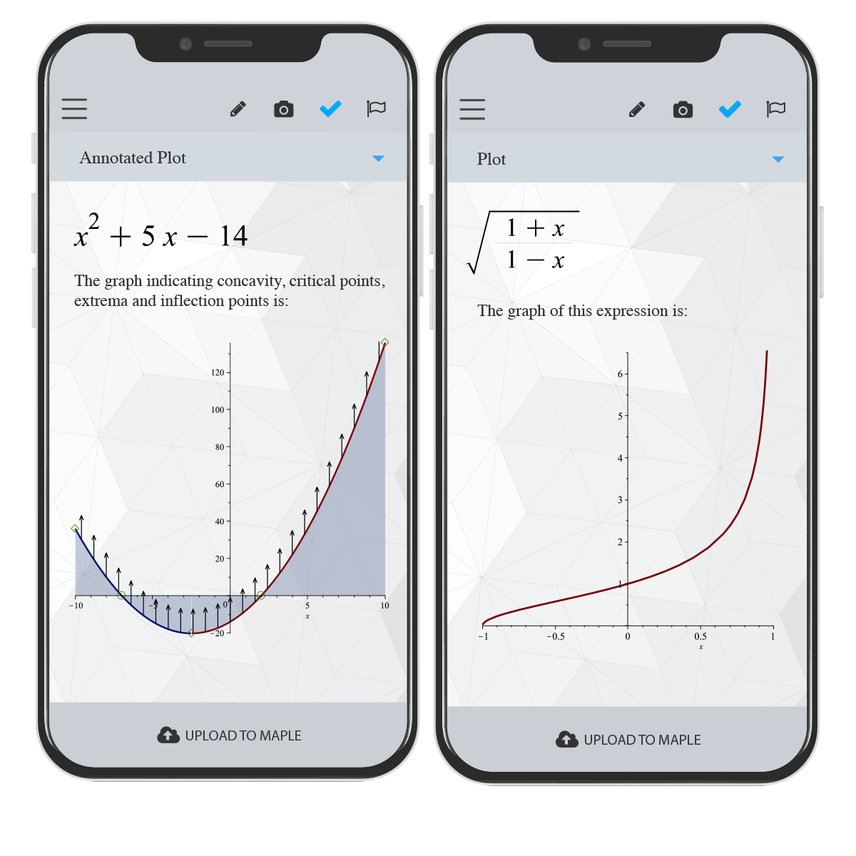 Maplesoft ™ acaba de lanzar una nueva versión de Maple ™ Companion, una aplicación móvil gratuita que ayuda a los estudiantes a aprender matemáticas y complementa al producto de software matemático Maple. El lanzamiento inicial utilizaba la cámara del teléfono para traer expresiones matemáticas a Maple, donde las matemáticas pueden resolver, visualizar, analizar y explorar. La nueva versión agrega poder matemático a la aplicación en sí, para que los estudiantes puedan resolver una amplia variedad de problemas matemáticos directamente en su teléfono y luego pasar fácilmente a Maple para realizar exploraciones más avanzadas.