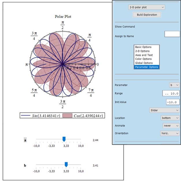 - Plot Builder en Maple 2023 ahora permite crear exploraciones de gráficos interactivos donde los parámetros se controlan mediante controles deslizantes o diales, y personalizarlos tan fácilmente como puede hacerse con otros gráficos.