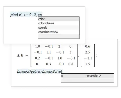 - Después de ingresar un nombre de comando, en muchos casos útiles, Maple ofrecerá automáticamente una lista de argumentos sugeridos para esa función, incluidas variables y opciones.