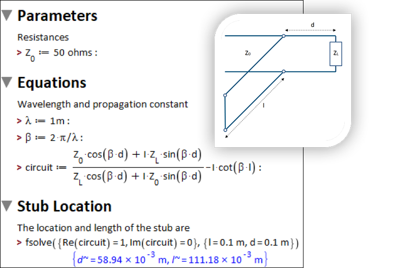 Los ingenieros de RF y microondas a menudo necesitan adaptar la carga a la impedancia de una línea de transmisión. Esto se conoce como adaptación de ramales (stubs) e implica la resolución numérica de un conjunto de ecuaciones no lineales. Esto requiere soluciones numéricas potentes, como las que se encuentran en fsolve. Esto reemplaza los enfoques tradicionales que utilizan diagramas de Smith. Los parámetros en estos problemas suelen tener dimensiones (por ejemplo, las resistencias se expresan en ohmios y las distancias en metros, etc.). Maple puede trasladar las unidades desde la definición de los parámetros hasta la solución numérica final de las ecuaciones. |