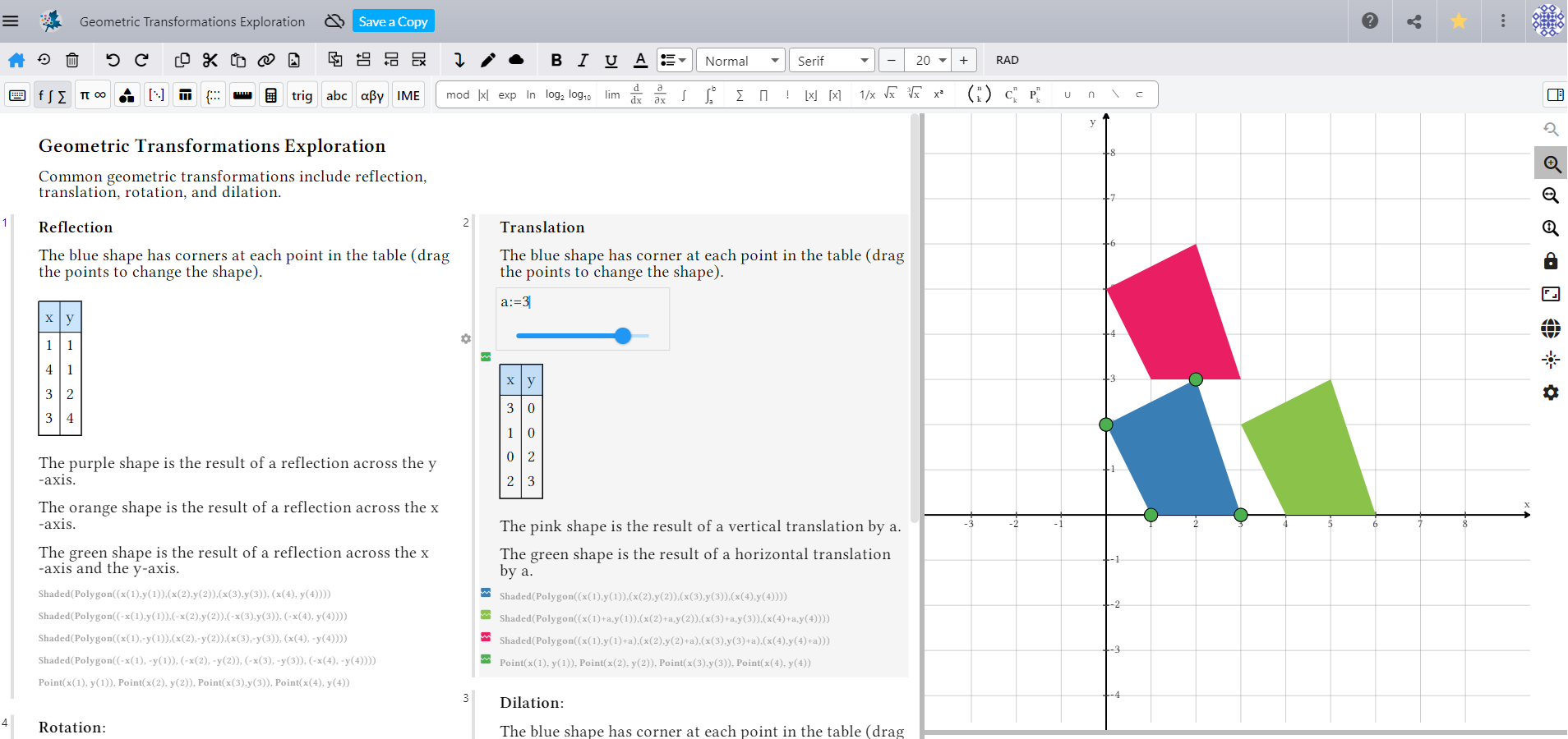 Ejemplo: Transformaciones geométricas En este ejemplo que demuestra transformaciones geométricas, los estudiantes pueden realizar reflexiones, rotaciones y dilataciones por sí mismos y ver los resultados al instante. Por ejemplo, pueden crear una figura y verla reflejada en los ejes x e y, trasladar una figura horizontal y verticalmente moviendo un control deslizante, o mover otro control deslizante para establecer un factor de dilatación y ver los resultados. |