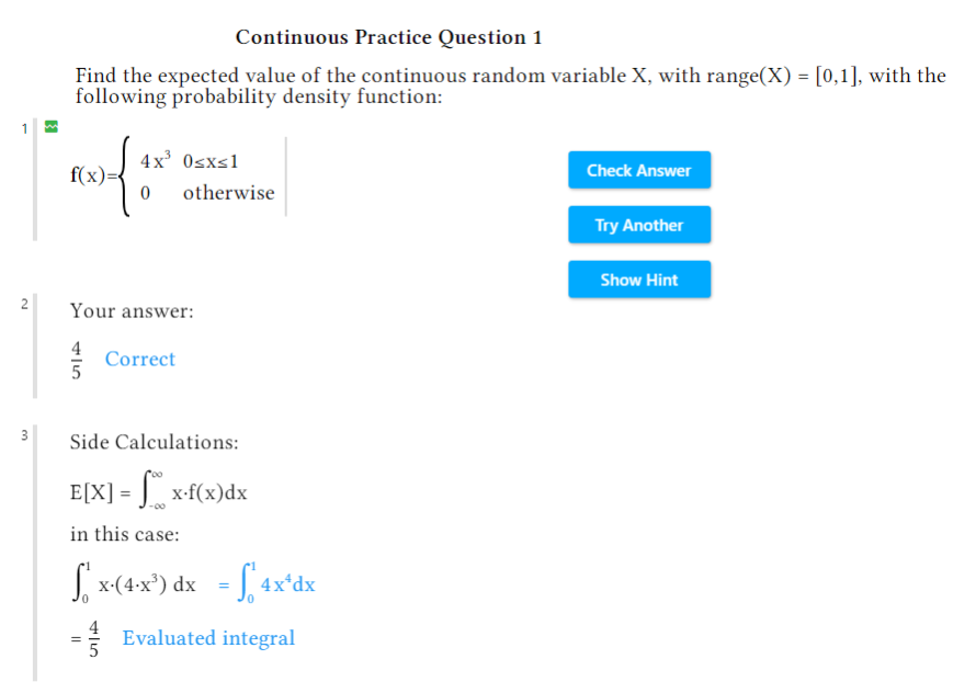 Ejemplo: Valor esperado Este documento genera preguntas que permiten a los estudiantes practicar la búsqueda del valor esperado de una variable aleatoria continua y luego comprobar sus respuestas. Primero, los estudiantes encuentran la solución dentro del documento, combinando pasos manuales y cálculos realizados por la herramienta. En este caso, el instructor optó por no incluir la opción de ver las soluciones completas, pero sí ofreció sugerencias. |