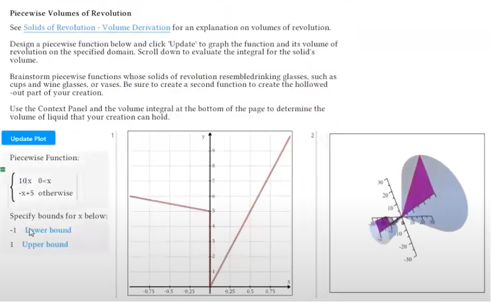 Ejemplo: Sólidos de revolución En este proyecto, se reta a los estudiantes a crear una función a trozos cuyo sólido de revolución se parezca a una copa de vino o un jarrón. Pueden probar varias funciones, con diferentes límites superiores e inferiores, y observar los resultados. Rápidamente, empiezan a pensar en cómo deberían modificar la función para obtener una forma más atractiva. El instructor también puede establecer un requisito para el volumen mínimo o máximo del recipiente, y los estudiantes pueden usar el software para configurar y resolver la integral y determinar el volumen de cada figura, y luego realizar ajustes adicionales a su función para refinar su vaso o jarrón. En el mismo entorno, el instructor puede pedir a los estudiantes que respondan preguntas que les obliguen a comunicar sus reflexiones y procesos de pensamiento. Ver: Proyecto: Diseña una copa de vino con sólidos de revolución |