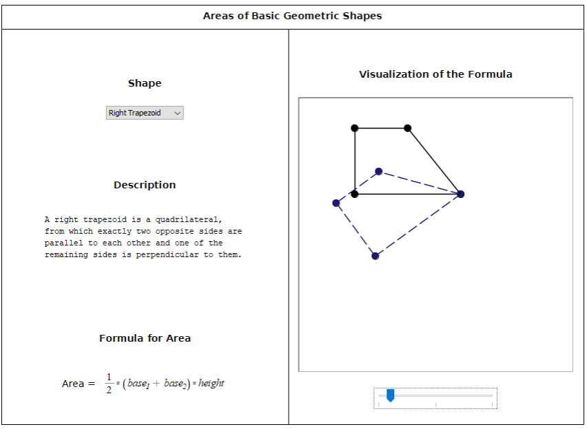 Ejemplo: Fórmulas de área de figuras geométricas básicas En esta aplicación, los estudiantes pueden animar la construcción geométrica detrás de la fórmula del área de una figura dada. Ahora, en lugar de memorizar un montón de fórmulas aparentemente aleatorias, pueden ver de dónde provienen, lo que les ayudará a recordarlas y les proporcionará técnicas para abordar problemas más complejos. Ver: Comprensión de las fórmulas de área de figuras geométricas |