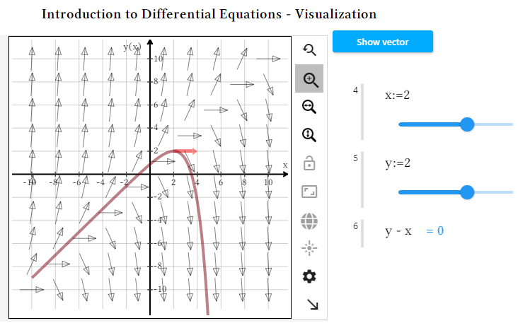 Ejemplo: Comprensión de ecuaciones diferenciales Una cosa es seguir los pasos para resolver una ecuación diferencial, pero otra muy distinta es comprender qué sucede realmente y por qué existen soluciones generales y particulares. En este ejemplo, los estudiantes ven un campo de direcciones para la ecuación diferencial elegida, la flecha de dirección en un punto específico y cómo la traza de una solución aproximada que pasa por ese punto sigue las flechas. Pueden experimentar seleccionando diferentes puntos y observando cómo cambian el vector y la solución en cada caso. Desarrollar su comprensión intuitiva mediante este tipo de exploración proporciona a los estudiantes una base sólida sobre la que desarrollar nuevas habilidades. |
