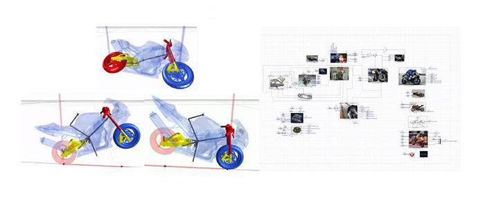 "El modelo también abarca múltiples dominios con la inclusión de elementos de comunicaciones como módulos Ethernet, y componentes, que incluyen una una tarjeta de conductor necesaria pare que el código funcione en la plataforma de simulacion de la motocicleta", explicó el Sr. Nicolo. "El objetivo era desarrollar un modelo de MapleSim que, una vez compilado fuera un ejecutable, que puediera ser utilizado directamente en el simulador," dijo. "MapleSim offrece una ventaja real como plataforma de integración de modelos – combinando modelos de varios dominos y técnicas de ingeniería – debido a las capacidades de Modelica de MapleSim y la capacidad de utilizar código C externo en modelos de MapleSim.”
