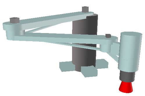 En la Figura 1 se muestra un ejemplo de un robot típico de manipulación industrial. El modelo de robot está montado en una base de referencia, a la que se conectan tres elementos que forman el brazo del robot. Los elementos son accionados por tres servomotores, que proporcionan el movimiento de rotación y el control con tres grados de libertad. El terminal final consiste en un componente translacional adjunto al tercer elemento, que permite la acción deseada de coger y colocar.