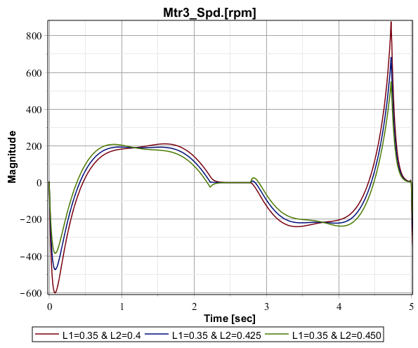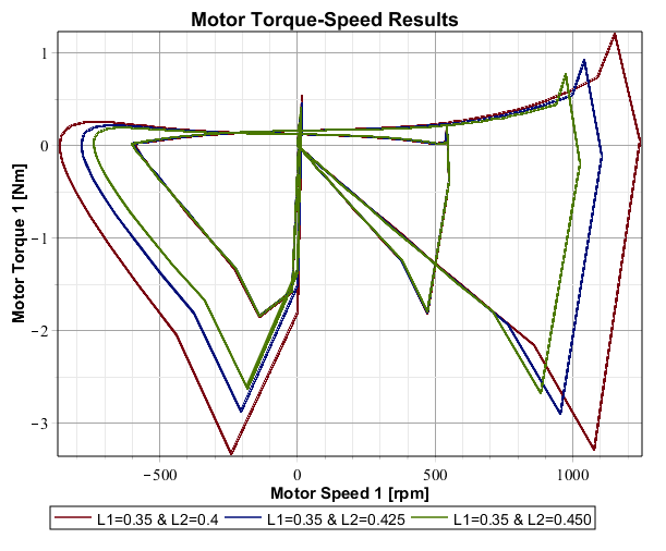 Otra herramienta de análisis desarrollada por Maplesoft fue un barrido paramétrico para observar los efectos de diferentes longitudes de elementos en la operación del robot. La simulación del modelo con diferentes configuraciones de longitud de elementos dentro de un rango permisible predeterminado permitió a la compañía observar los efectos correspondientes en las características de rendimiento, como la velocidad del motor, el par, los requisitos de carga y las variaciones del espacio de trabajo. Maple hace uso automático del procesamiento paralelo, lo que permite que la computadora del usuario ejecute simultáneamente varias simulaciones utilizando diferentes valores de parámetros, y luego presenta los resultados superpuestos en una ventana de visualización para una comparación rápida y fácil.