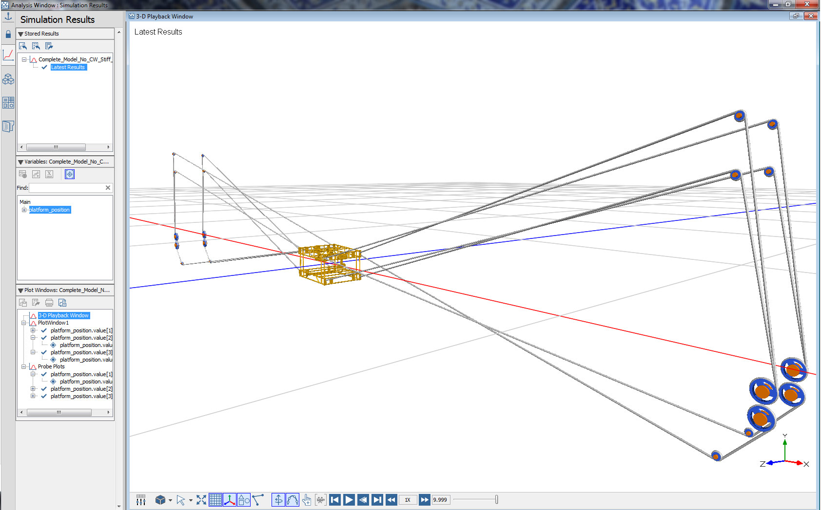 Los resultados de la simulación del robot se pueden visualizar en MapleSim utilizando una representación en 3D de los sistemas de poleas en combinación con el CAD previamente importado. Los resultados iniciales de la simulación muestran las vibraciones problemáticas de la plataforma central. Sin un control de movimiento adecuado, estas vibraciones limitarían tanto la velocidad como la seguridad del funcionamiento del robot. El modelo de MapleSim se utilizaría para probar y validar varias estrategias de control para minimizar estas vibraciones, permitiendo al mismo tiempo las velocidades máximas de funcionamiento seguras.