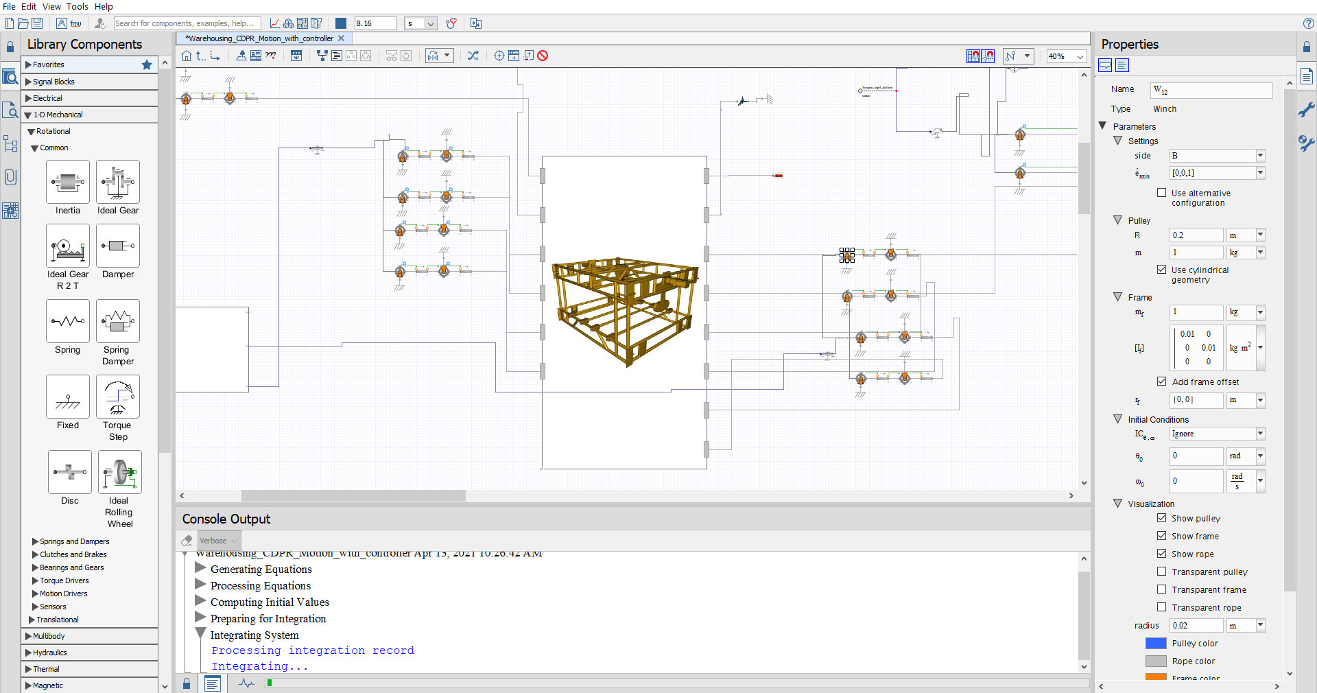 Para crear el modelo del robot en MapleSim, el Dr. Jamshidifar importó su modelo CAD preexistente de la plataforma móvil del robot. Al importar su modelo CAD, pudo importar automáticamente las geometrías de la plataforma, la información de masa e inercia y la información del modelo 3D para fines de visualización. Luego, el modelo se completó conectando componentes estándar de MapleSim, incluidas poleas, cabrestantes y cables. Para probar el modelo, los cabrestantes se accionaron mediante fuerzas simplificadas para simular el movimiento del robot a lo largo de una trayectoria de movimiento rectangular.